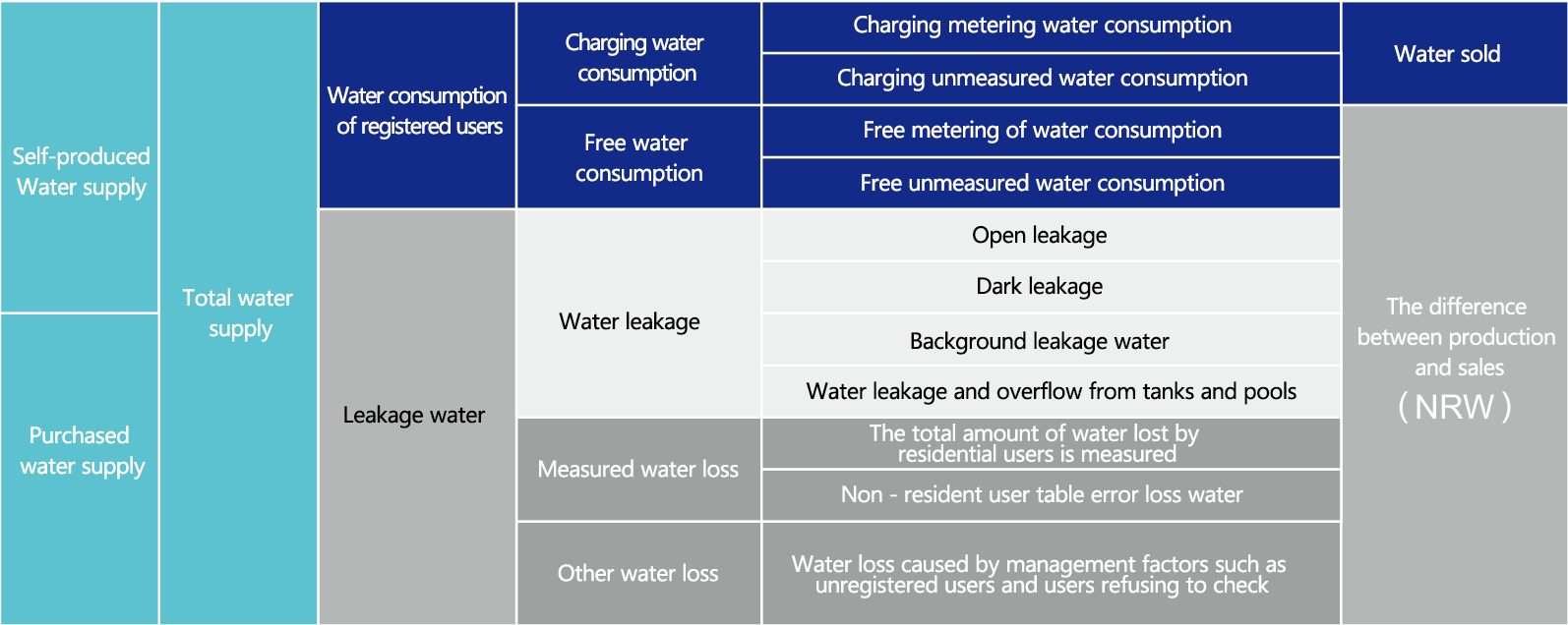 Water difference between production and sales = free water supply + physical water leakage + book water leakage